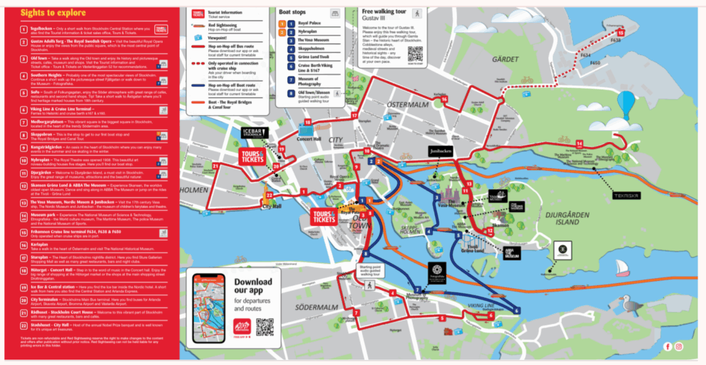 以我的經驗,欲在Google Earth 飛覽某一座城市,最基本的要素當然是這座城市需為3D城市,斯德哥爾摩大部分已符合需求,另外最好是有條穿經城市的路線我可以讓它動態的移動,比如馬拉松路線,斯德哥爾摩是有城市馬拉松,不過這一回我倒是看上每一個大城市大多會有的觀光巴士路線 Hop On-Hop Off Bus Route,這條路線係以遊客的觀光需求來規劃,總共有22站。