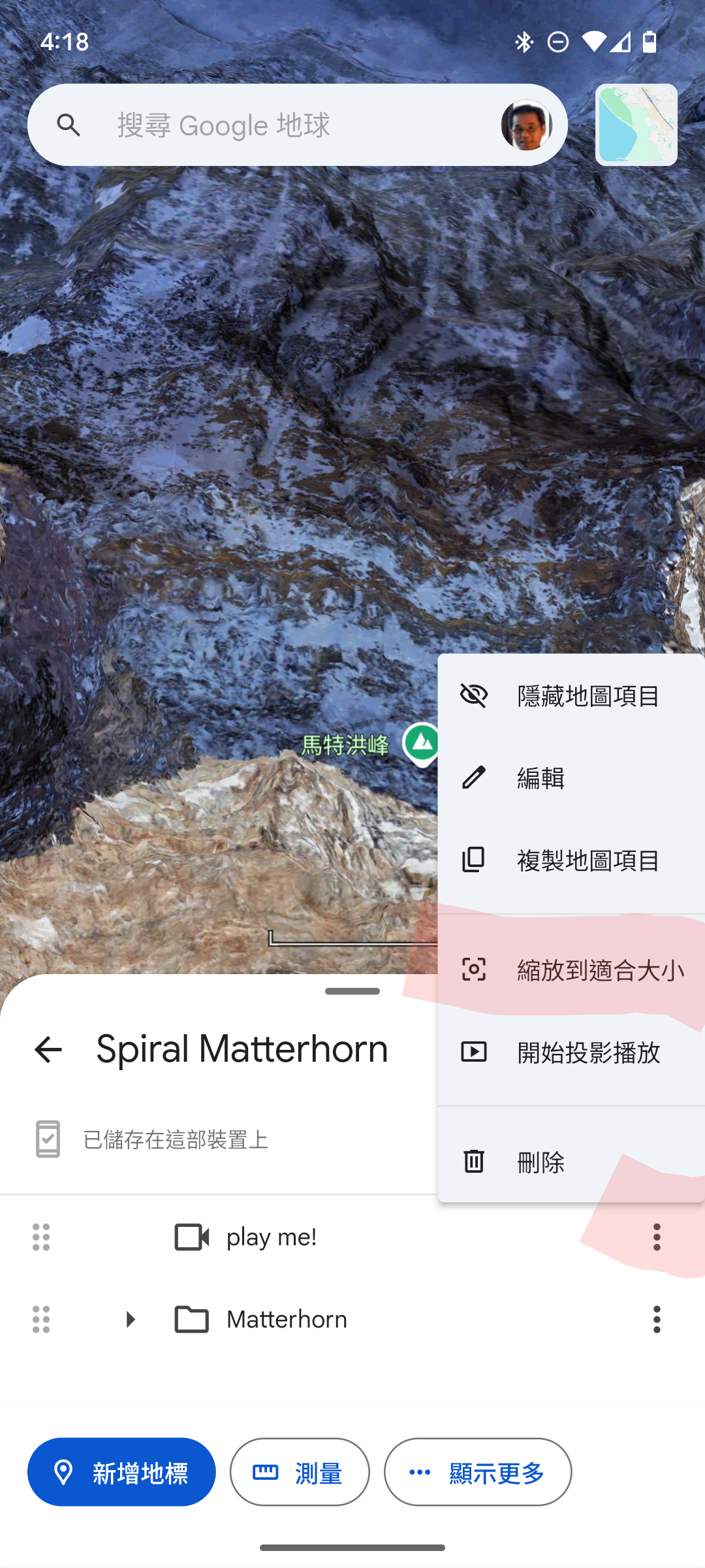 [備註]Google Earth Web/App的操作介面在114/7/22又作了更新。若您想自行操作馬特洪峰的環繞飛覽,請在新介面點撃”縮放到適合大小”選項。