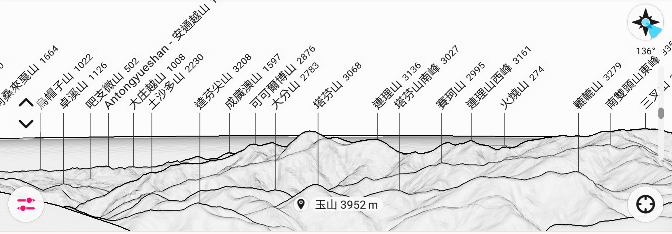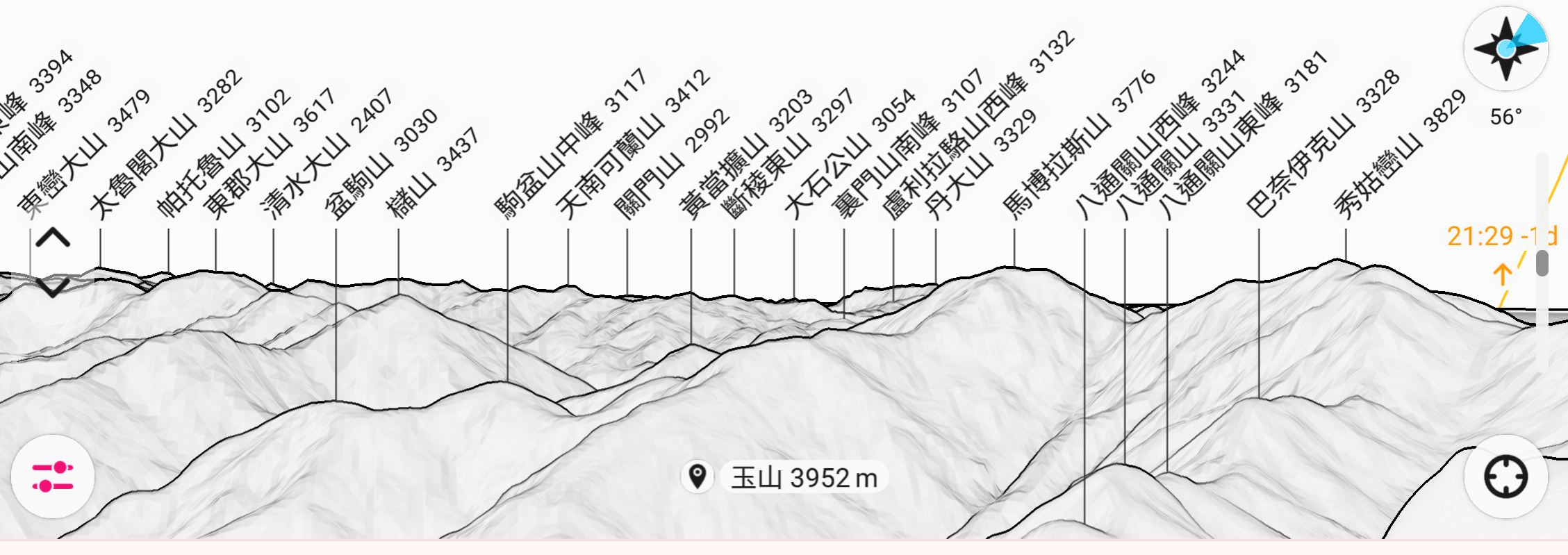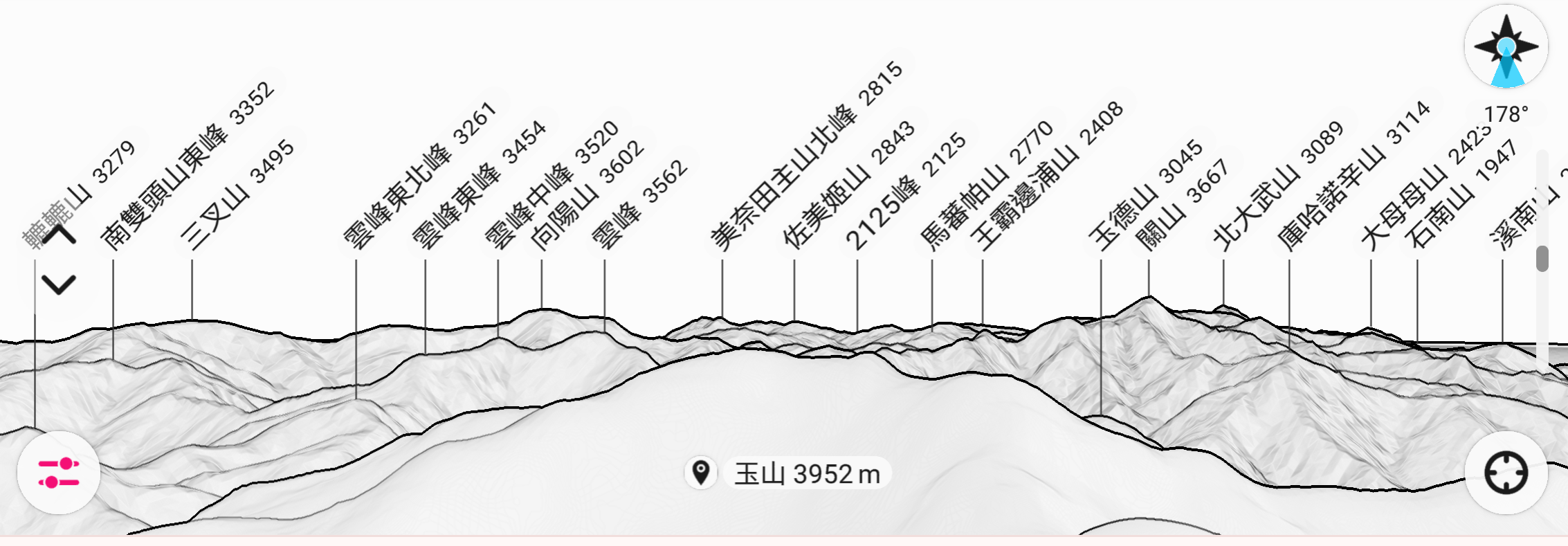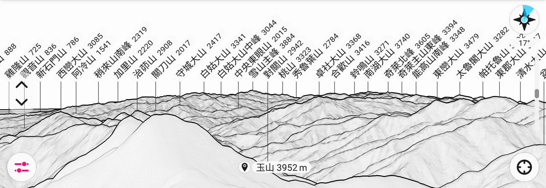 對大多數人來說,光看山形實難分辨是那座山,所以我從PeakFinder辨識山頭軟體,分別依方位取五段截圖來輔助辨示,若飛覽過頭,您也可以按下”Pause”,手動操控街景圖,慢慢的來比對辨示。
