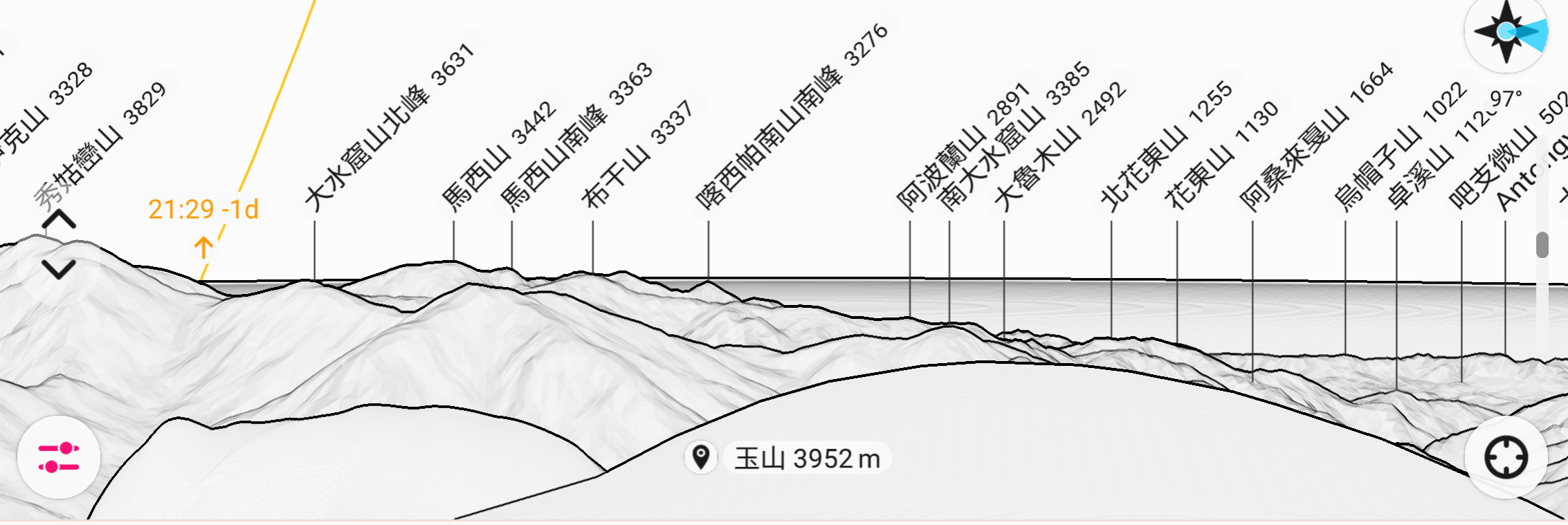 我想到我最近開發的單張空拍環景圖飛覽技術,不如就拿來運用,玉山山頂的視野,北可看到雪山山脈,南可看到北大武山,但3000公尺以上的高山大多落在雪山山脈及中央山脈的東半邊,所以這次的飛覽我只飛覽東半邊,北從方位角357度的西巒大山,南到方位角194度的庫哈諾辛山,來回飛覽,中間有多處有明顯的山形,會標示山名並超作逗留。